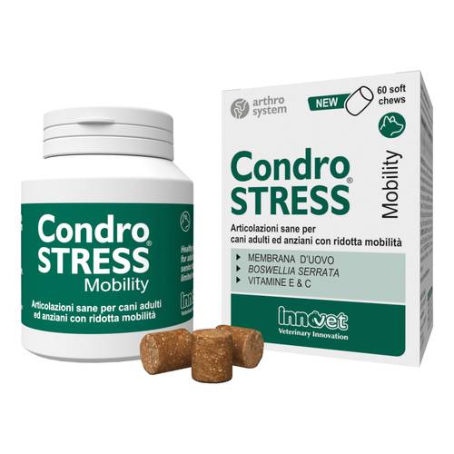 CondroSTRESS MobilityDescrizione Mangime complementare per supportare la corretta funzione articolare di cani adulti e anziani con ridotta mobilità. La membrana d'uovo costituisce una fonte di collagene, con i glicosaminoglicani e aminoacidi solforati. La vitamina E e la vitamina C svolgono funzioni antiossidanti, proteggendosi a vicenda e neutralizzando i radicali liberi prodotti nell'ambiente articolare. Caratteristiche nutrizionali Principio funzionale per stick Membrana d'uovo 125 mg Boswellia serrata 10 mg Vitamina E 7,5 mg Vitamina C 25 mg Modalità d'uso Somministrare direttamente in bocca per periodi...